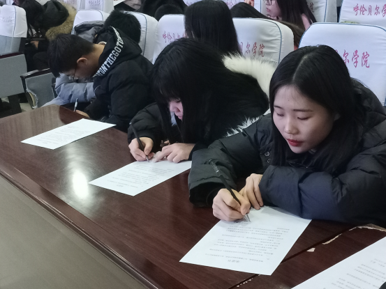 随后,副院长刘启云宣读《呼伦贝尔学院考试规则》、《呼伦贝尔学院学生违反考试纪律的处分规定》,重申考试规则与考试纪律,强调严明考风考纪的重要性和严肃性,让考生认识考试违规作弊的严重后果并引以为戒,增强学生自律意识,消除学生侥幸心理,引导学生认真备考,诚信考试。2019年国家奖学金获得者贾雪婷介绍自己的成长和学习经历,激励同学们努力学习,丰富自己大学生活。2019级学生代表姚树峰宣读有关“诚信考试、杜绝作弊”的诚信考试倡议书,全体参会学生签写了考试诚信承诺书。