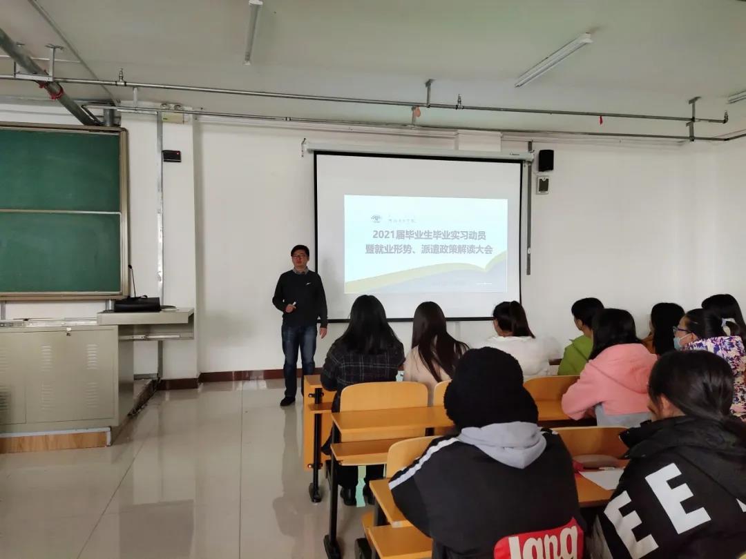 为了使2021届毕业生更好的了解就业形势,扎实推进2021届毕业生实习工作顺利开展,pp电子游戏平台官网于11月4日上午8:30在崇文楼B401举办2021届毕业生毕业实习动员暨就业形势、派遣政策解读大会。出席本次动员大会的有pp电子游戏平台官网副院长王英利、团学办公室主任张迪及2017级全体毕业生。