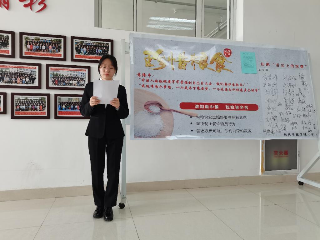 紧接着,进行第二项议程,由pp电子游戏平台官网学生代表赵书毓宣读倡议书。“我们要自觉维护节俭用餐的良好风气,自觉抵制舌尖上的浪费,争做光荣的“光盘”族。积极向身边的亲朋好友宣传节约粮食、拒绝浪费的做法,争做“节约粮食、拒绝浪费”的践行者、宣传者、推动者。”