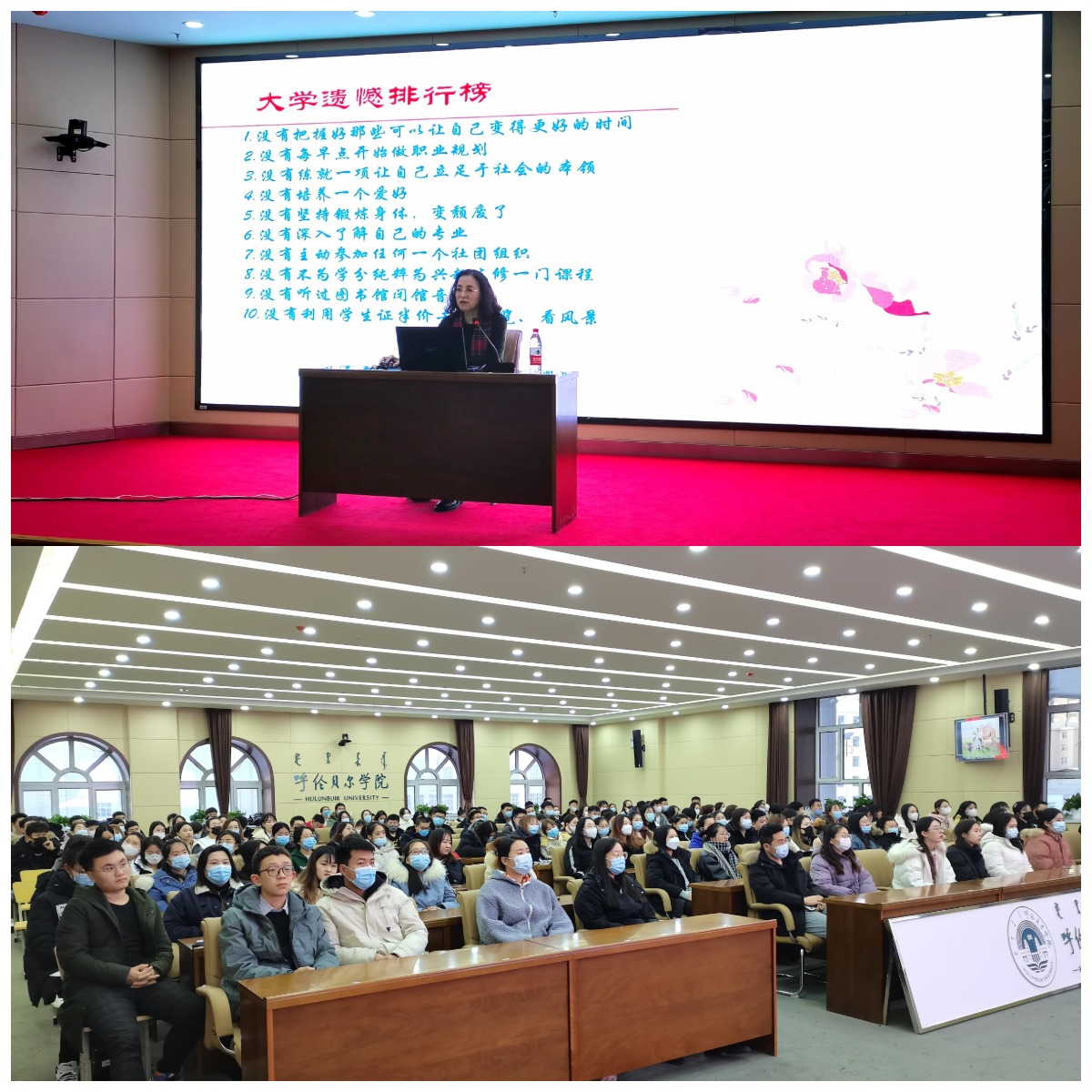 讲座伊始,李雪峰院长以“上大学意味着什么”带领同学们回顾校园生活点滴,每个精彩瞬间仿佛再次浮现在大家眼前,历历在目,李雪峰院长送给在场同学们一句话“春风十里,不如呼院有你”,希望同学们在毕业之后,经常回母校看看。接着,李雪峰院长给同学们播放一段pp电子游戏平台官网2016级学生制作的毕业视频,并告诉同学们要活在当下,现在不努力,将来就要奔跑,还展示“大学遗憾排行榜”,警醒同学们从现在开始撰写毕业论文,大学里有资源丰富的图书馆,有答疑解惑的老师,现在是写毕业论文最好的时间。紧接着,李雪峰院长和同学们讨论如何看待毕业和就业。李雪峰院长提出,现在就业的大问题是“慢就业、懒就业,”她告诫同学们,毕业之后不一定能找到最喜欢的工作,主要是要找到适合自己的工作,同时也提醒同学们,远离诈骗,远离就业培训贷。最后,李雪峰院长给予同学们寄语:未来,你必须面对的是继续成长,并走向独立。站在山脚,永远不知道山顶的风景。因为成长,要保持良好的习惯,不让芯片取代灵魂,莫让浮云遮蔽双眼。