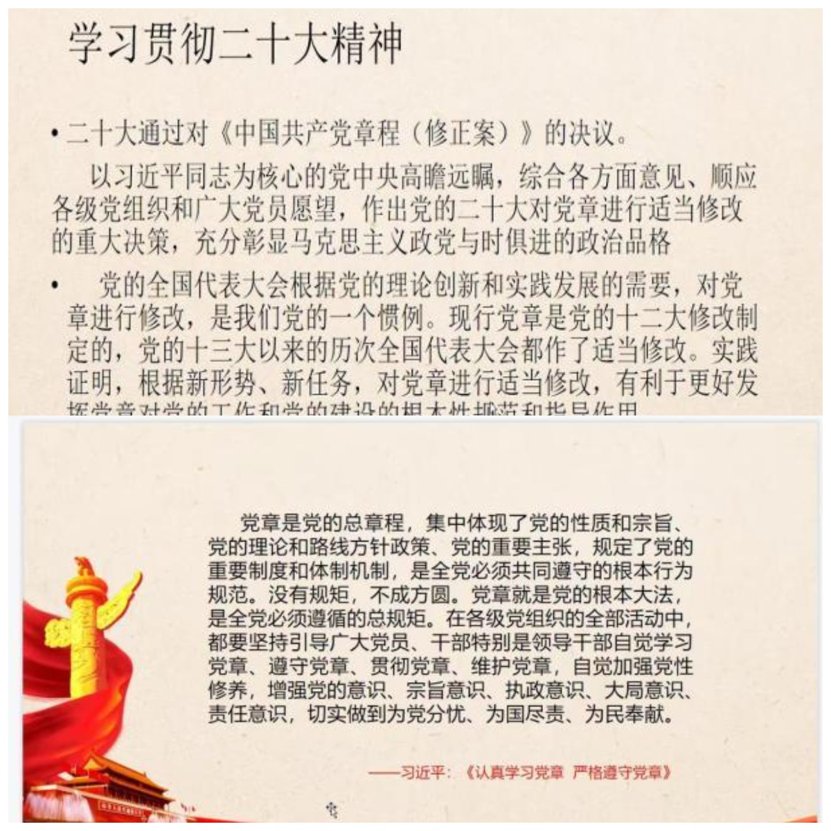 紧接着,李静书记为大家讲解中国共产党党章建设历程,十九大、二十大党章修改的主要内容,使学生党员明白了党章是党的总章程,集中体现了党的性质和宗旨、党的理论和路线方针政策、党的重要主张。更加加深了学生党员们对党的了解,使其更加坚定了成为一名合格党员的决心。同时,学生党员们发现自身还有很多不足之处,今后应该加强自身修养,学习党的最新思想,关注党的最新动向,早日成为一名合格的共产党员,为人民服务!