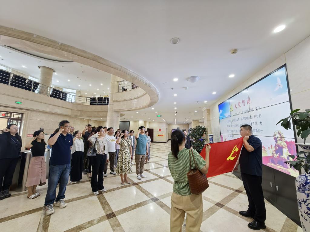参观结束后,全体党员怀着无比崇敬的心情,在图书馆一楼前庄严列队,面向党旗举行了集体宣誓仪式。在领誓人的带领下,全体党员面向鲜红的党旗,高举右拳,重温入党誓词。“我志愿加入中国共产党……”铿锵有力的誓言在厅内回荡,表达了全体党员对党的无限忠诚和为共产主义奋斗终身的坚定决心。这一刻,参观学习所汲取的文化滋养和榜样力量,都凝聚在这庄严的承诺之中。
