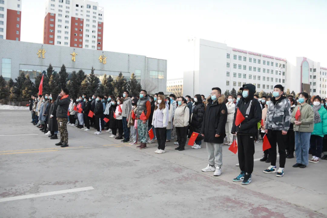鲜艳的五星红旗随着庄严嘹亮的《义勇军进行曲》缓缓升起,五星红旗随风飘扬,在场师生脱帽行注目礼,共同唱响国歌。浓浓的爱国热情,激荡在每一个人的胸怀。